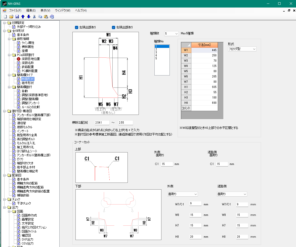 割付済みの各壁高欄に対する付属品設定と連動し、構造図・配筋図・鉄筋加工図を自動作成。